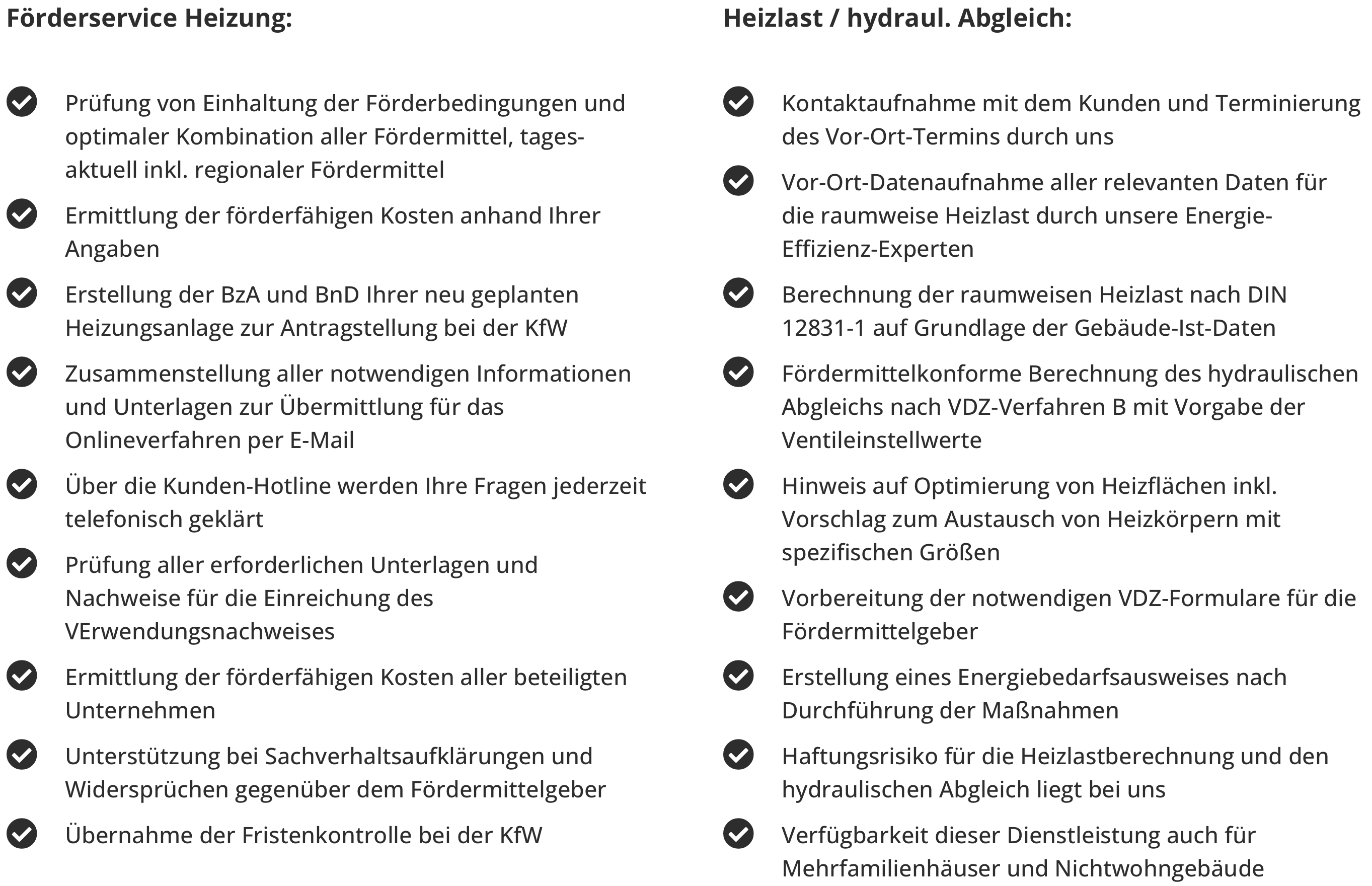Produkt-Bundle FS Heizung / HA Beauftragung unseres Bundleangebots ab 1.190,00 € 0% Angaben zum Antragsteller / Objektinhaber Welchen Förderservice möchten Sie beauftragen?* Heizung Antragsteller:* ---Bitte wählen--- PrivatpersonWEGFirmaContractor Firma / WEG / Contractor:* Anrede:* ---Bitte wählen--- HerrFrau Vorname:* Name:* Straße, Hausnummer:* PLZ:* Ort:* Telefon: E-Mail:* Eigentümer des Objekts?* Ja Nein Vorsteuerabzugsberechtigt?* Ja Nein Wird die Investition für wirtschaftliche Zwecke getätigt?* Ja Nein Weiter Angaben zum Fachhandwerker / Fachplaner Firmenname Fachhandwerker:* Anrede:* ---Bitte wählen--- HerrFrau Vorname: Name:* Straße, Hausnummer:* PLZ:* Ort:* Telefon: E-Mail:* Zurück Weiter Angaben zur Immobilie Abweichende Objektadresse?* ---Bitte wählen--- JaNein Straße, Hausnummer:* PLZ:* Ort:* Baujahr (oder Bauantragsdatum):* Gebäudeart:* ---Bitte wählen--- EinfamilienhausZweifamilienhausMehrfamilienhaus Anzahl Wohneinheiten:* ---Bitte wählen--- 1234567 Wohnfläche in m²:* Vom Antragsteller selbstgenutzte Wohneinheiten:* Anzahl der Wohneinheiten die von der Maßnahme betroffen sind:* Nettoraumfläche nach DIN 277:* Niedrig beheizte Zone 12°C-19°C:* ---Bitte wählen--- JaNeinkeine Angabe Denkmalschutz:* ---Bitte wählen--- JaNein Mehrere Gebäude:* ---Bitte wählen--- JaNein Bitte Lageplan hochladen:* Datei hierhin ziehen oder zum hinzufügen klicken. Die Immobilie befindet sich in einem Gebiet mit ausgewiesenem Anschluss- und Benutzungszwang für ein Wärmenetz (Fernwärme/ Nahwärme)* ---Bitte wählen--- JaNeinkeine Angabe Energieversorger Heizung: Energieversorger Strom: Zurück Weiter Einkommensbonus Ich möchte den EINKOMMENSBONUS in Anspruch nehmen (nur bei selbstgenutztem Wohneigentum möglich). Das zu versteuerndes Haushaltsjahreseinkommen beträgt maximal 40.000,00 € im 2. und 3. Kalenderjahr vor Antragstellung.* ---Bitte wählen--- JaNein Hinweis zum Einkommensbonus: Wer ein zu versteuerndes Haushaltsjahreseinkommen von bis zu 40.000 Euro hat, erhält mehr Förderung für den Heizungstausch. Ermittelt wird dafür der Durchschnitt aus den zu versteuernden Einkommen des zweiten und dritten Jahres vor Antragstellung - für einen Antrag 2024 wird also der Durchschnitt der Einkommen aus 2021 und 2022 gebildet. Relevante Haushaltsmitglieder sind alle zum Zeitpunkt der Antragstellung in einer Wohneinheit mit Haupt- oder alleinigem Wohnsitz gemeldeten volljährigen Eigentümer sowie deren dort mit Haupt- oder alleinigem Wohnsitz gemeldeten Ehe- und Lebenspartner oder Partnerinnen aus eheähnlicher Gemeinschaft. Nachgewiesen wird das Einkommen ausschließlich mit den Einkommensteuerbescheiden! Zurück Weiter Angaben zur bestehenden Heizungsanlage Baujahr der alten Heizung:* Heizlast des Gebäudes in kW (nach DIN EN 12831): Was passiert mit der alten Heizungsanlage?* ---Bitte wählen--- Heizungsanlage bleibt bestehenHeizungsanlage wird ausgebaut und fachgerecht entsorgt Art der bestehenden Heizungsanlage:* Gaszentralheizung Gasetagenheizung Kohleheizung Ölheizung Biomasseheizung Wärmepumpe Solarthermie Nachtspeicherofen Photovoltaik Anlage Zurück Weiter Geplante Einzelmaßnahme (Heizung / Wärmeerzeugung) Art der Wärmeerzeugung:* Wärmepumpe Solarthermie Biomasse Gebäudenetz Anschluß Fernwärme Brennwertgerät H2 Ready Systemtemperatur (Vorlauf / Rücklauf):* ---Bitte wählen--- Fußbodenheizung (35/28°C)Heizkörper (55/45°C)Sonstige Sonstige Systemtemperatur:* Betriebsweise der Wärmepumpe:* ---Bitte wählen--- MonovalentMonoenergetischBivalent Monovalent:Dies ist der Fall, wenn ein Wärmeerzeuger den gesamten Wärmebedarf allein decken kann und wenn keine weitere Energieart (z. B. Solar) zusätzlich eingesetzt wird. Monoenergetisch:Dies ist der Fall, wenn der Wärmeerzeuger den gesamten Wärmebedarf nicht allein decken kann und ein weiterer Wärmeerzeuger mit der gleichen Energieart (z. B. Strom) zusätzlich eingesetzt wird. Bestimmte Heizsysteme (z. B. Luft-Wasser-Wärmepumpe) benötigen die Unterstützung durch einen zweiten Wärmeerzeuger (z. B. Elektro-Heizstab), um bei sehr kalten Außentemperaturen noch für behagliche Raumtemperaturen sorgen zu können. Bei korrekter Auslegung der Luft-Wasser-Wärmepumpe kommt es nur in wenigen Stunden im Jahr dazu, dass der Elektroheizstab zugeschaltet wird. Auf den Gesamtjahresstromverbrauch hat das so gut wie keine Auswirkungen. Bivalent:In einem bivalenten Heizsystem produzieren zwei Wärmeerzeuger die zur Raumheizung und/oder Warmwasserbereitung benotigte Wärmeenergie. Ein Beispiel ist die Kombination eines Gas-Brennwertkessels mit einer Solarthermie-Anlage. Für die Warmwasserbereitung wird dabei ein bivalenter Warmwasserspeicher eingesetzt. Darüber hinaus wird der Begriff "bivalent" auch in der Wärmepumpentechnik verwendet. Hier dient er zur Beschreibung des Parallelbetriebs einer Wärmepumpe und einem konventionell betriebenen Heizgerät.Ein bivalentes Heizsystem wird auch Hybridheizung genannt. Art der Wärmepumpe:* ---Bitte wählen--- Luft / LuftLuft / WasserWasser / WasserSole / Wasser Leistung Brunnenpumpe (kW):* Brunnenbohrung vorhanden:* ---Bitte wählen--- JaNein Mit Zwischenwärmetauscher:* ---Bitte wählen--- JaNein Erdkollektoren vorhanden:* ---Bitte wählen--- JaNein Erdsonden-Bohrung vorhanden:* ---Bitte wählen--- JaNein Biomasse - Pufferspeicher vorhanden:* ---Bitte wählen--- JaNein Weiternutzung geplant:* ---Bitte wählen--- JaNein Größe des vorhandenen Pufferspeichers in Liter:* Zurück Weiter Uploads Upload Lieferungs- und Leistungsvertrag:* Datei hierhin ziehen oder zum auswählen klicken. Hinweis:Hier den Vertrag downloaden Upload Angebot:* Datei hierhin ziehen oder zum auswählen klicken. Upload Grundriss und Schnitt: Datei hierhin ziehen oder zum auswählen klicken. Sonstige Anmerkungen / Notizen Zurück Weiter Auftragsbestätigung Förderservice Heizung + Heizlastberechnung / Berechnung hydraulischer Abgleich für 1-2 WE: 1.190,00 € (zzgl. 19% MwSt.) Förderservice 